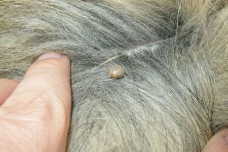 上圖是牛蜱成蟲,它會死死地叮住寵物的皮膚,開始吸血,吸血後身體會膨漲,像一粒豆。